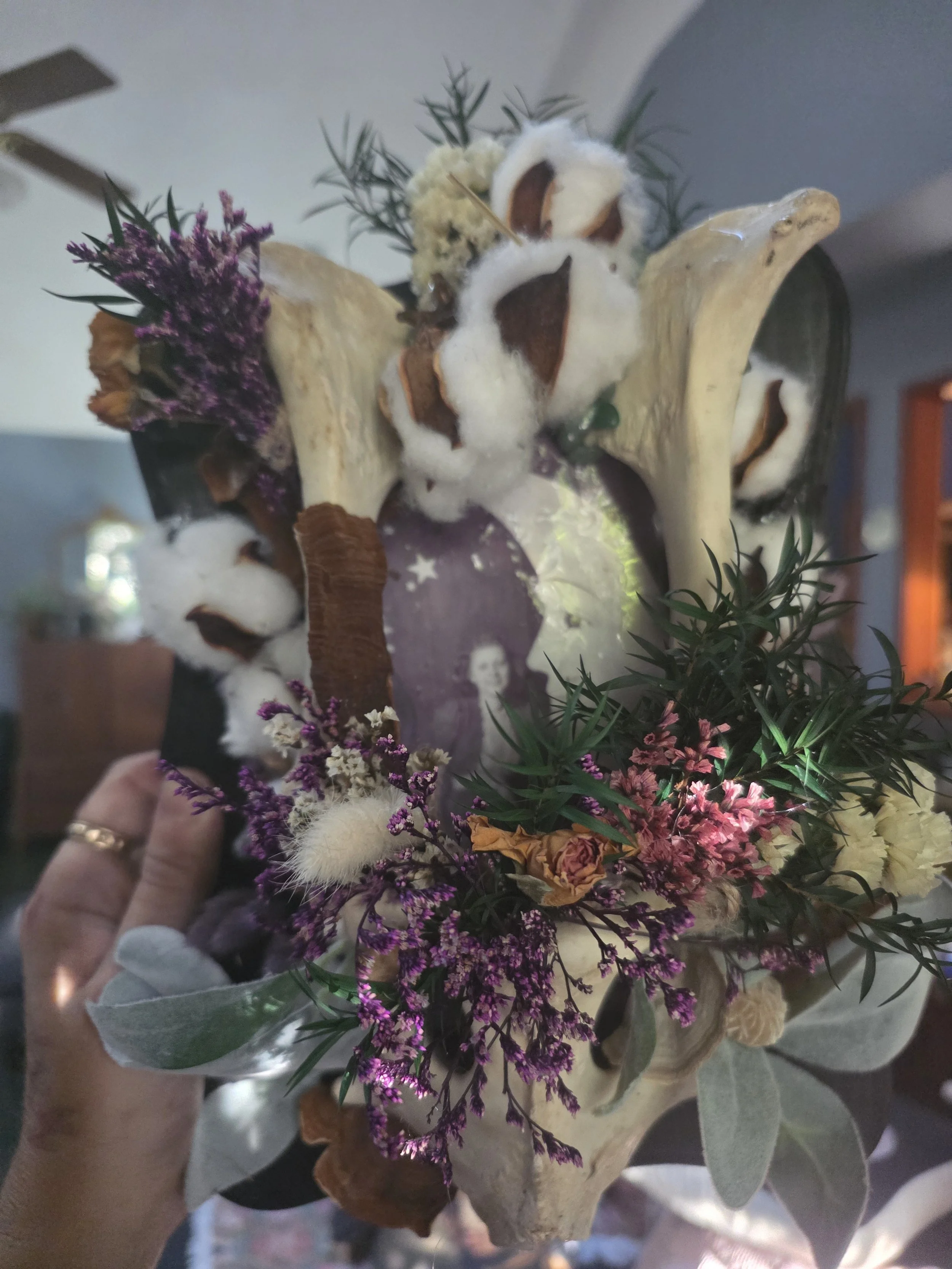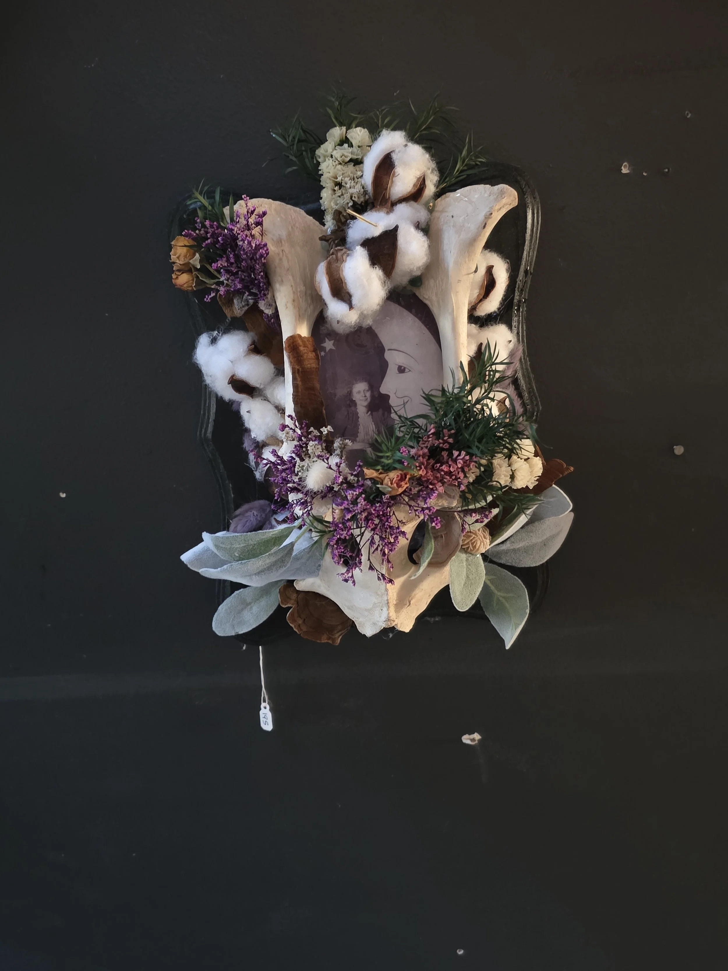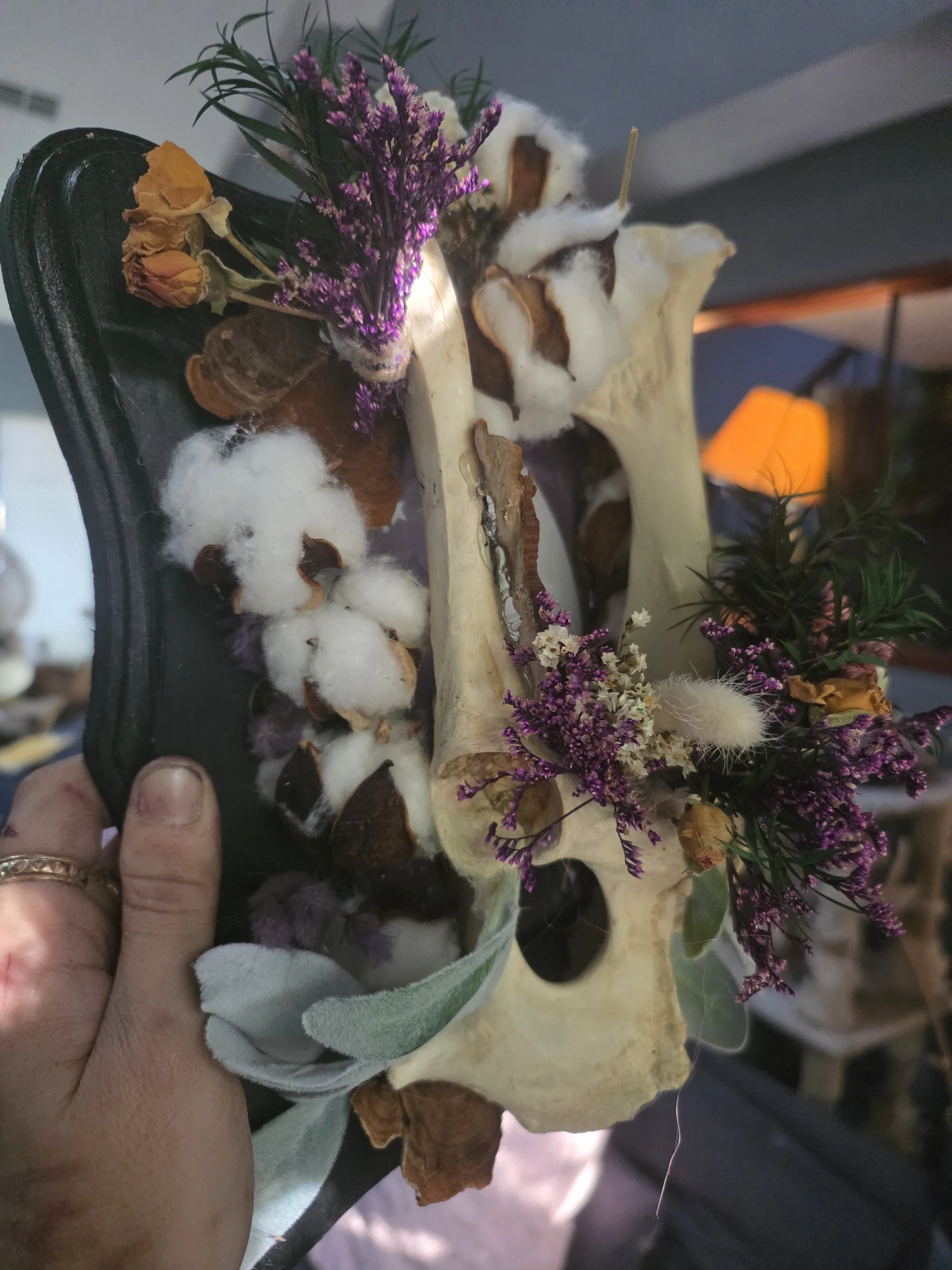 This one-of-a-kind natural art piece blends bone, botanical elements, and woodland textures into a sculptural arrangement inspired by the quiet beauty of the forest floor. At the center of the composition rests a large natural vertebra bone, carefully cleaned and preserved, forming the foundation of a small “bone garden” surrounded by dried florals, fungi, and natural plant elements.