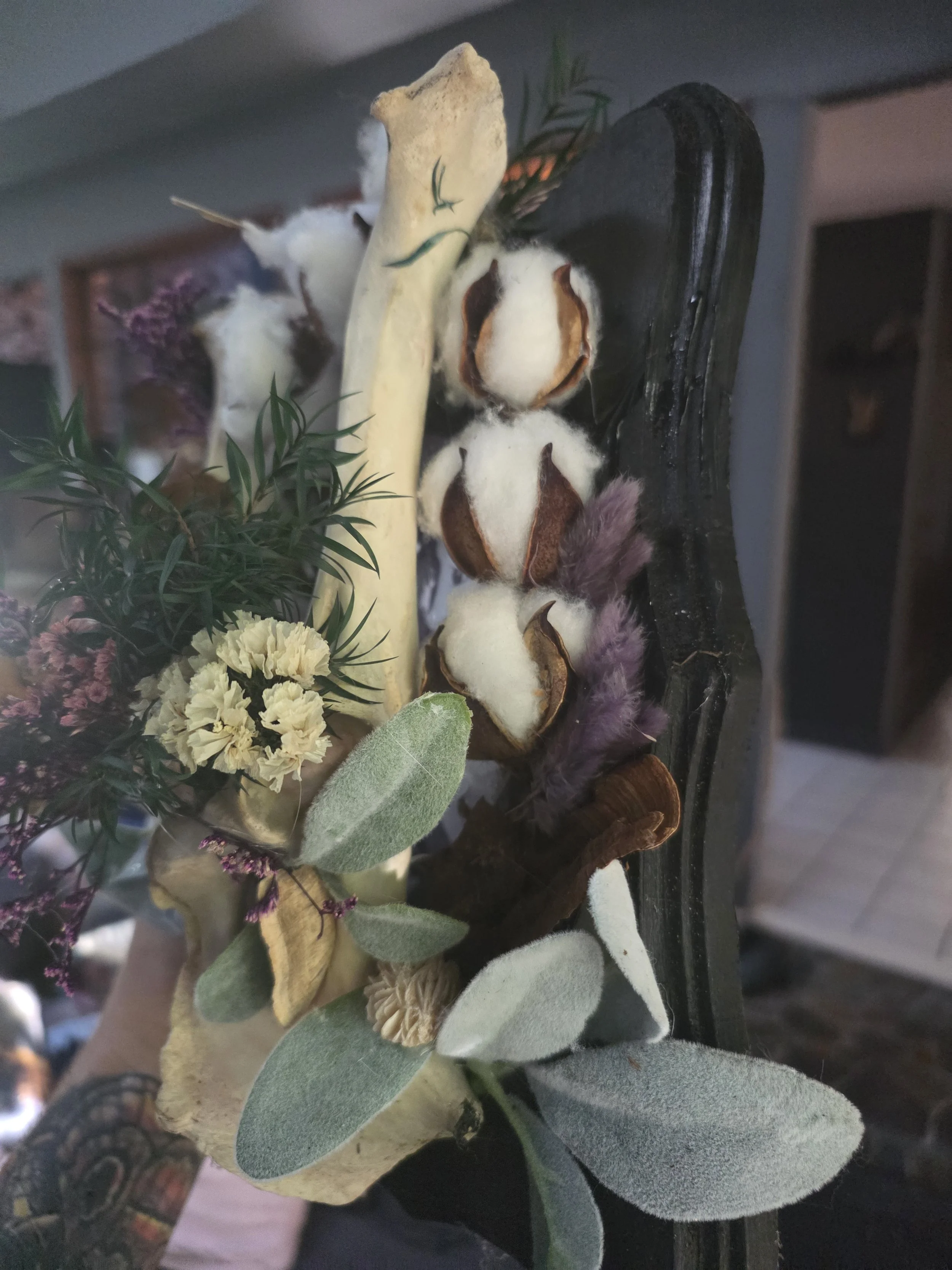 Each element has been intentionally arranged by hand to create a balance between natural structure and botanical softness. The vertebra bone serves as both a sculptural anchor and a reminder of the interconnected cycles of nature—growth, decay, and renewal. The surrounding dried florals and fungi mirror the natural processes of the forest, where plants and organisms grow together in quiet harmony.