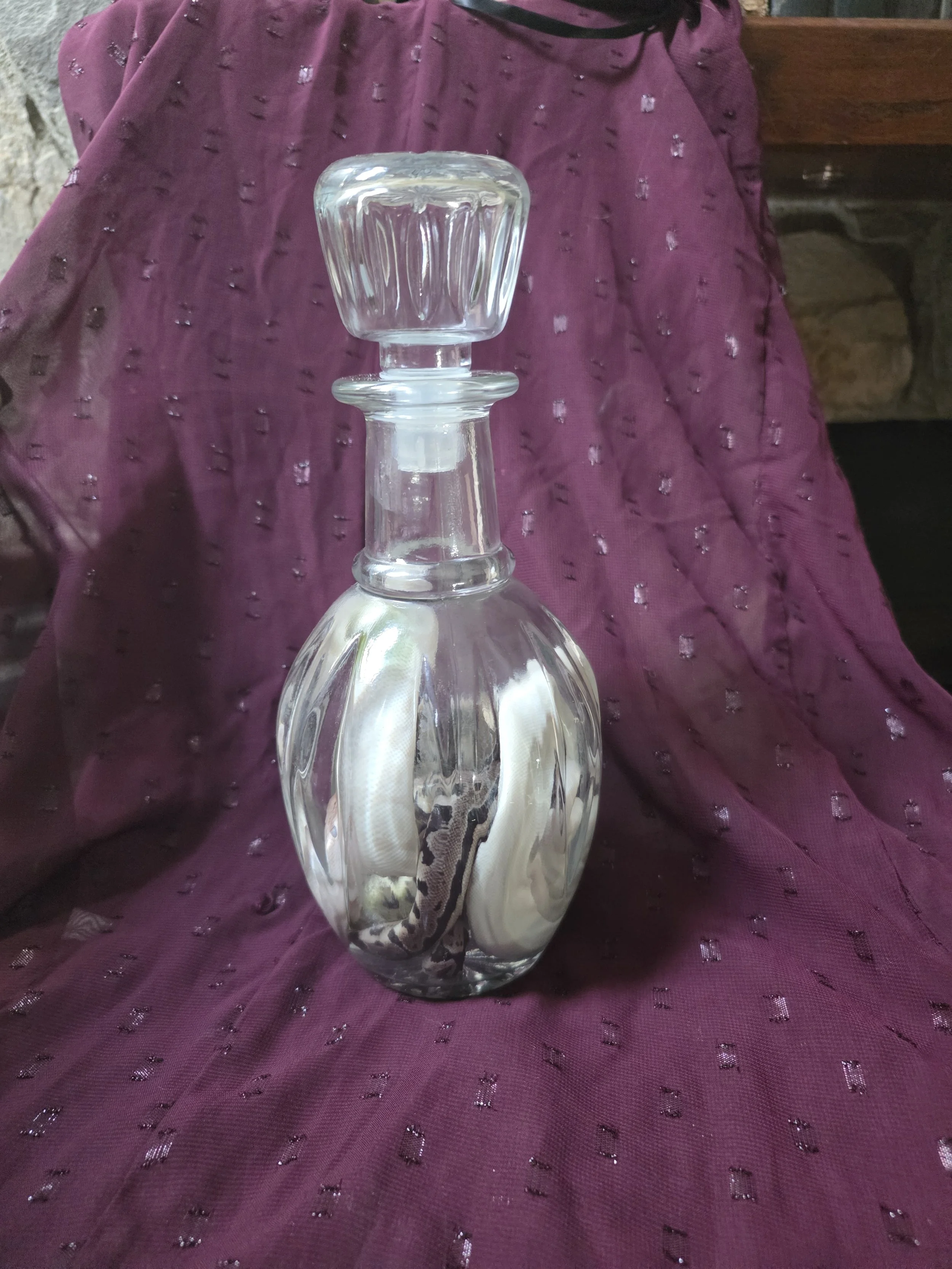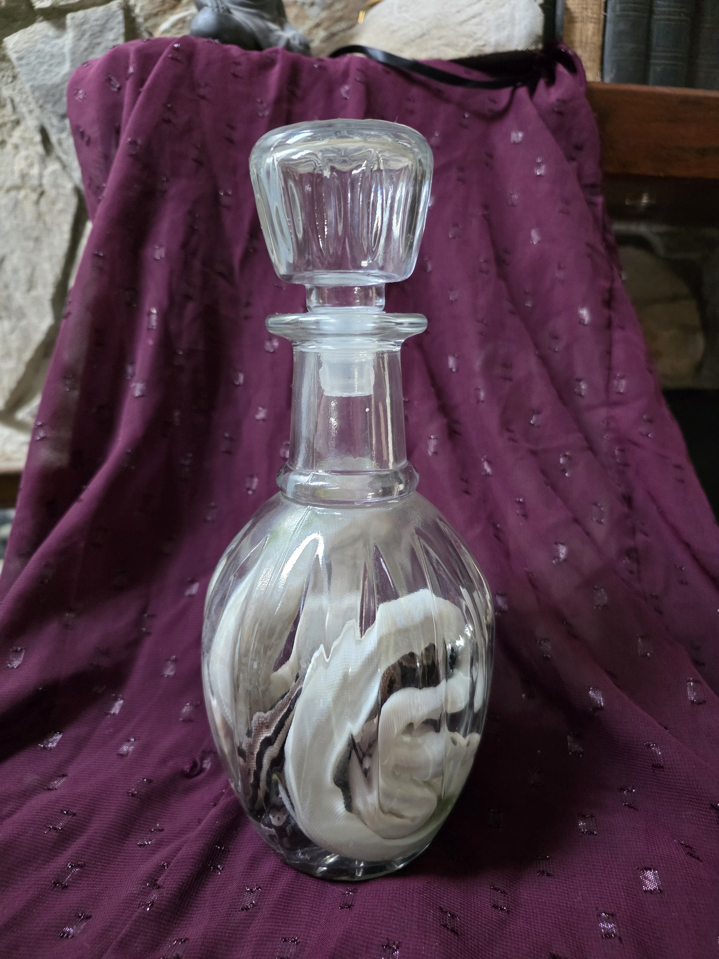 The vintage decanter itself adds a refined gothic aesthetic, transforming the specimen into a true curiosity cabinet centerpiece suitable for collectors of natural history, oddities, and taxidermy art.